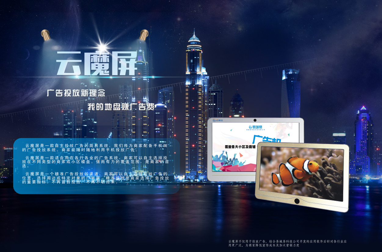 易城易云魔屏+是互聯網+傳媒+智能硬件與軟件的科技。專注打造“互動媒體+廣告”的新媒體平臺,以做為應用場景,增加商家的宣傳價值、開創互聯網互動媒體新局面。